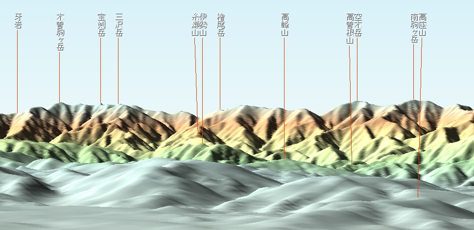 中央アルプスに関しては、主稜線と、それより木曽側(西側)に位置するピークは、殆ど見ることができます。まず全体像とカシバード画像とを示します。