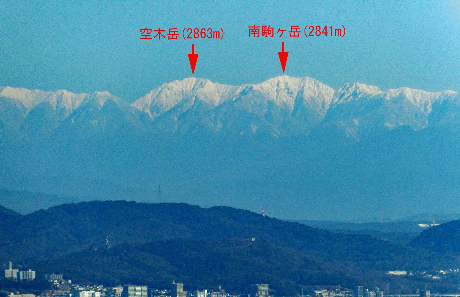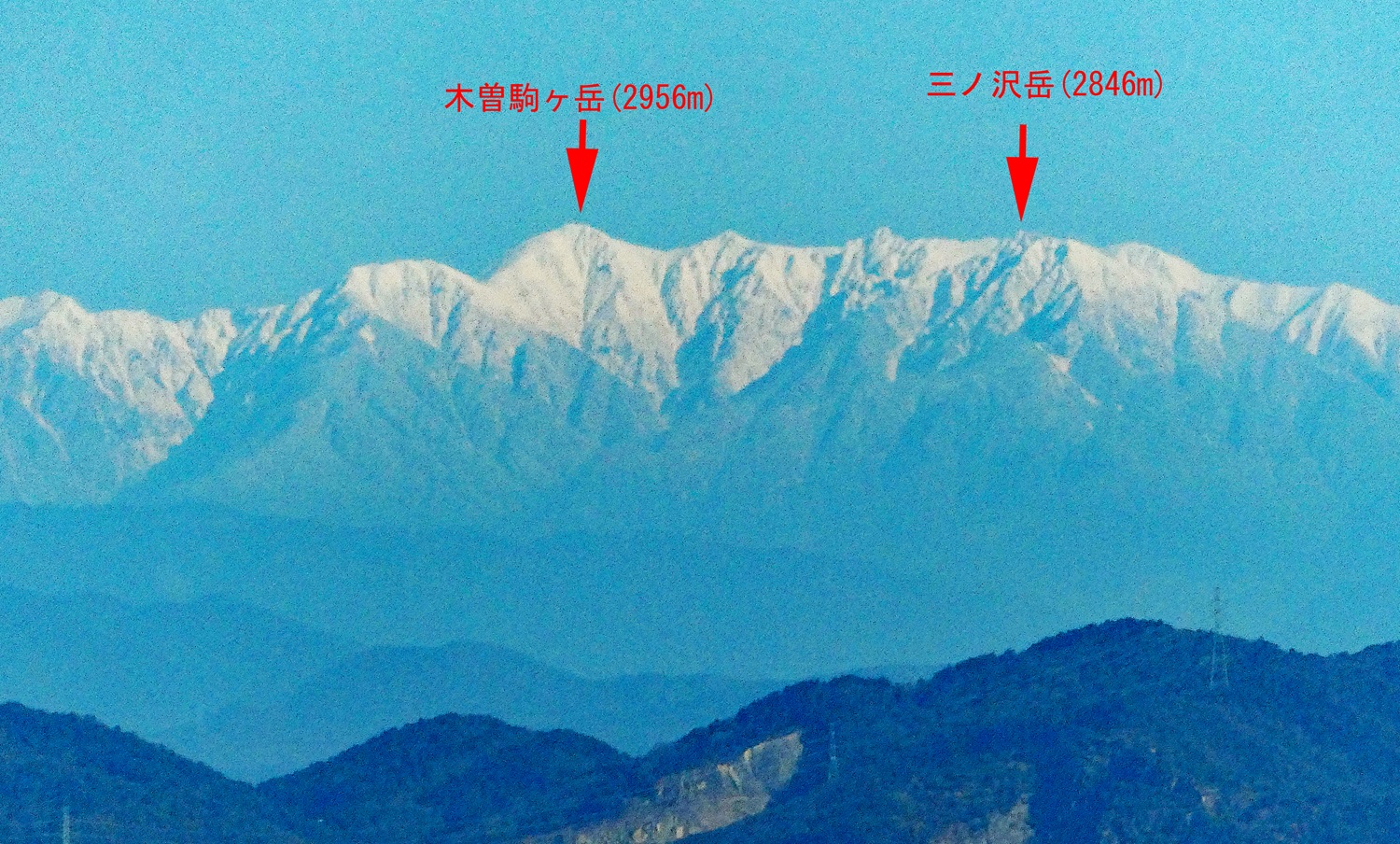 空木と南駒、中ア南部の両雄です。中アは比較的名古屋に近く、撮影地から空木岳までの距離は 104kmほどになります。